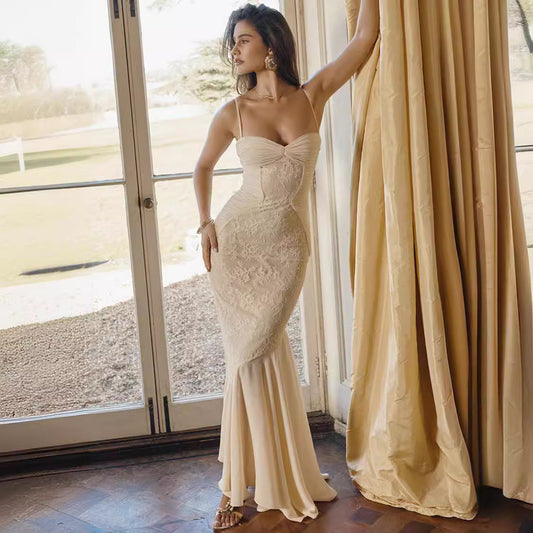 Dress for Women – Evening Long – Satin Bodycon – Lace Sleeves – Heart-Shaped Bustier