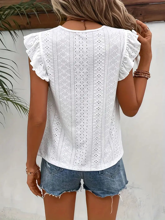 Women's Blouse - Breathable Cotton - Eyelet Pattern - Ruffle Sleeves - Round Neck