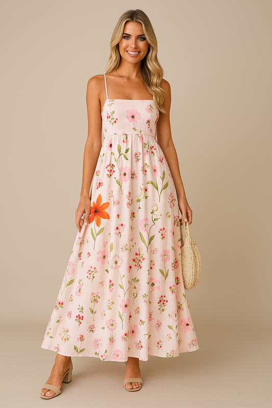 Dress for Women – Maxi A-line – Lightweight – Floral Print – Backless with Straps