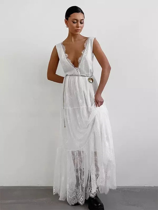 Dress for Women – Long with Lace – Deep V-Neck – Sleeveless Elegant Fit