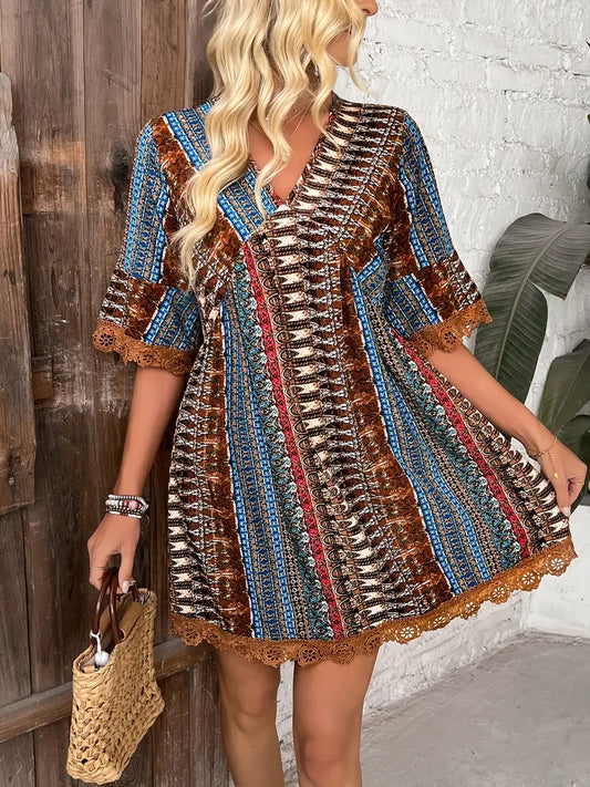 Women's Dress - Bohemian Pattern - V-neck - A-line Fit - 3/4 Sleeves with Ruffle Details