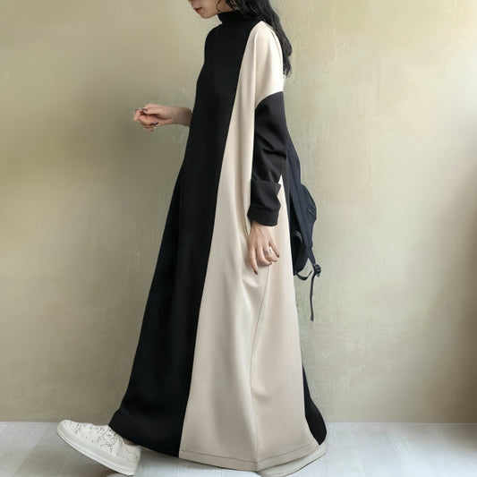 Dress for Women – Maxi Length – Loose Fit – Long Sleeves – High Neck – Contrast Side Panel