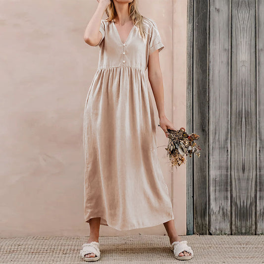 Women's Dress – Loose Fit – V-Neck with Buttons – Midi – Cotton-Linen Mix
