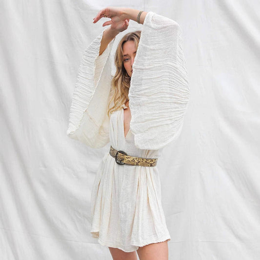 Women's Dress – Loose Fit – V-Neck – 3/4 Sleeves – Belt at Waist – Mini Length