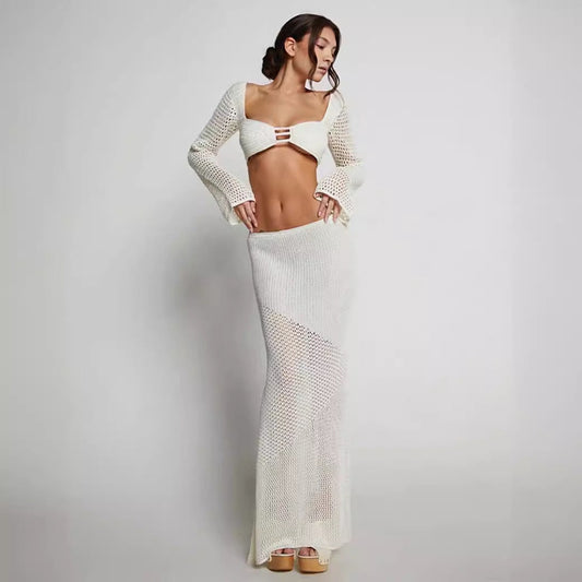 Women's Knit Skirt Set – Slim Fit – Long-Sleeve Crop Top – Breathable Soft Knit