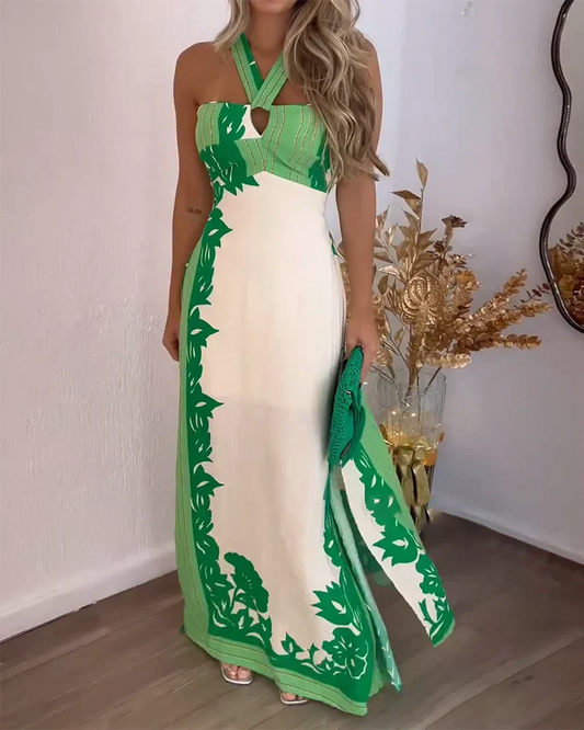 Women's Maxi Dress – Halterneck with Cross Straps – Nature-Inspired Print – Elegant Fit