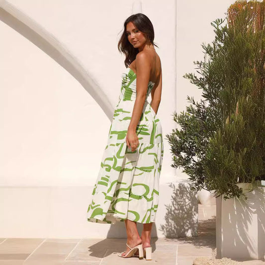 Women's Maxi Dress – Lightweight Woven Fabric – Relaxed Fit – V-Neck – Open Back – Print Design