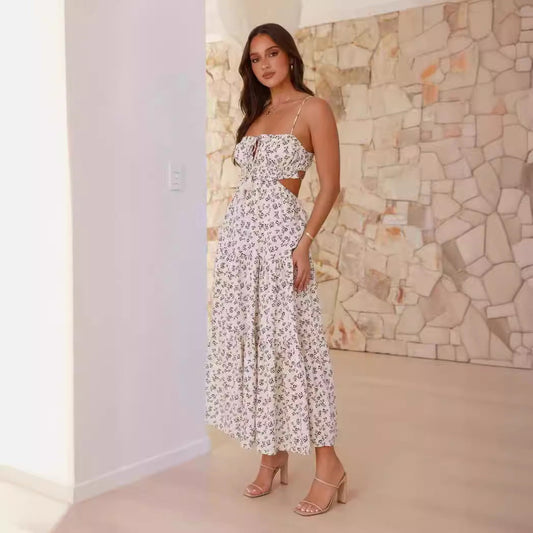 Women's Maxi Dress – Sleeveless A-line – V-neck – Light and Luxurious with Cut-out Waist