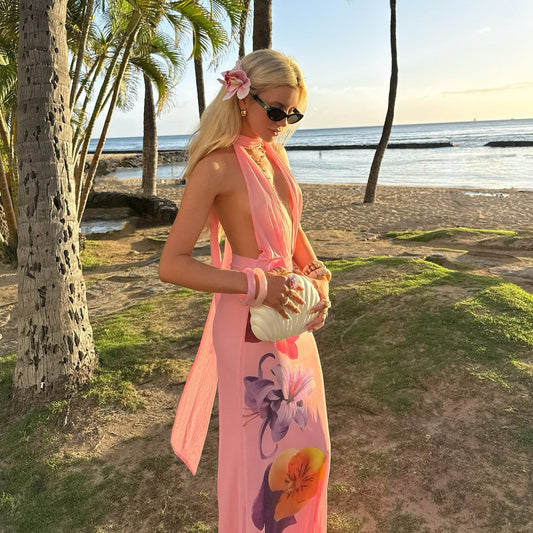 Women's Maxi Dress – Slim Fit – Mesh – Halterneck – Deep V-neck – Floral Print