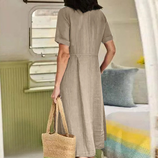 Women's Midi Dress - Button Closure - V-Neck - Short Sleeve - Loose Fit - With Side Pockets
