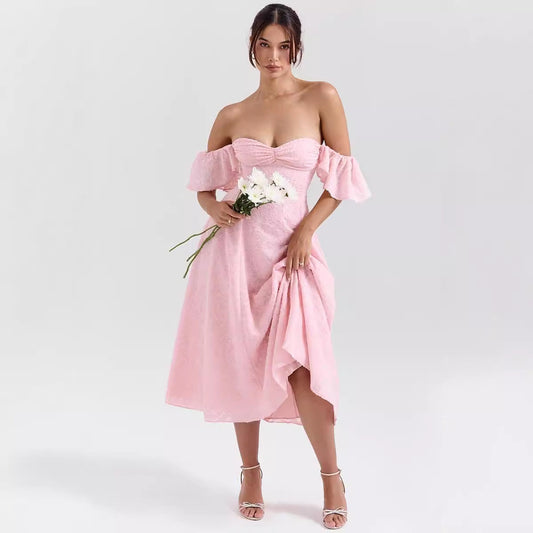 Women's Midi Dress – Jacquard Woven – A-line – Square Neck – Ruffle Sleeves