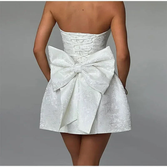 Women's Mini Dress – Jacquard Texture – Strapless Sweetheart Neckline – Bow Detail at the Back