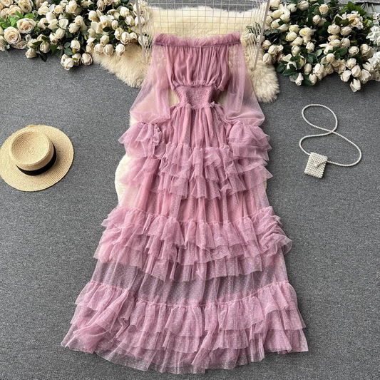 Women's Off-Shoulder Dress - Tulle - Maxi Length - Elegant Layered Design
