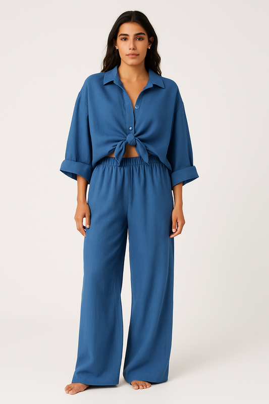 Women's Outfit Set – Oversized Shirt with Tie Front – Wide Pants – Light and Breathable