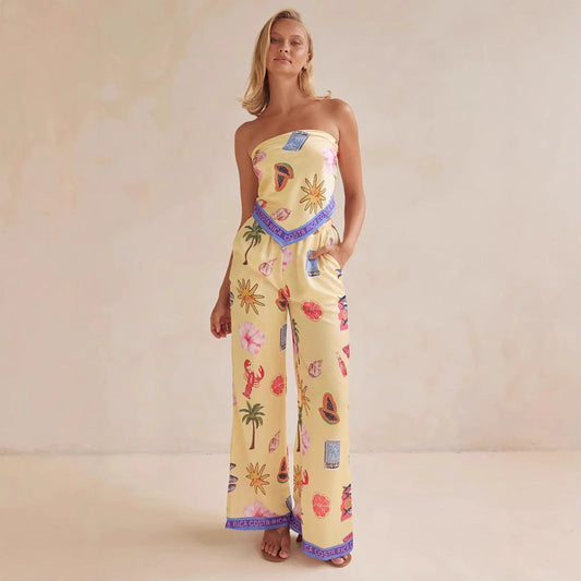 Women's Set – Strapless Satin Top – Wide Trousers – Relaxed Fit – Patterned Design