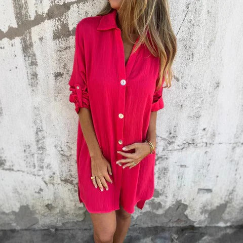 Women's Shirt Dress – Relaxed Fit – Button Closure – Breathable Blend – Rolled-Up Sleeves