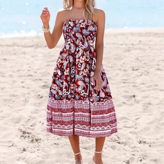 Women's Strapless Summer Dress - A-line Fit - Elastic Waist - Floral Pattern