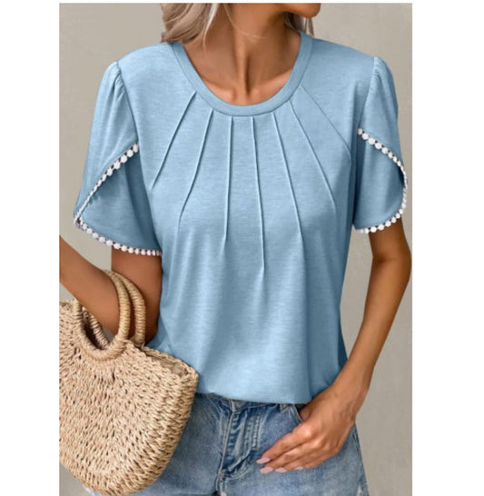 Women's T-shirt – Relaxed Fit – Soft Knit – Ruffle Sleeves – Pleated Front
