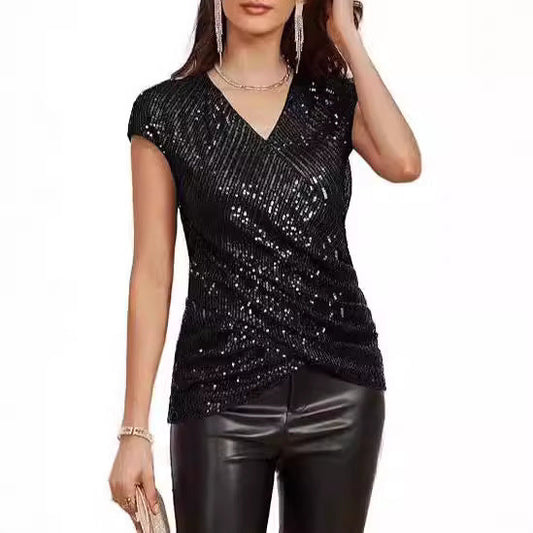 Women's Top – Slim Fit – V-neck – Sequin Details – Asymmetric Waist Draping