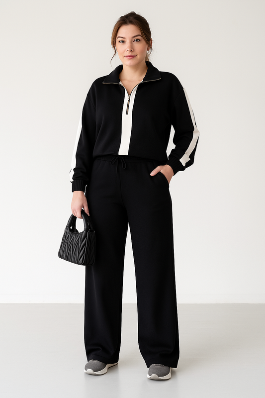 Women's Two-piece Set – Casual Fit Zip Collar Top & Wide Pants – Breathable Design