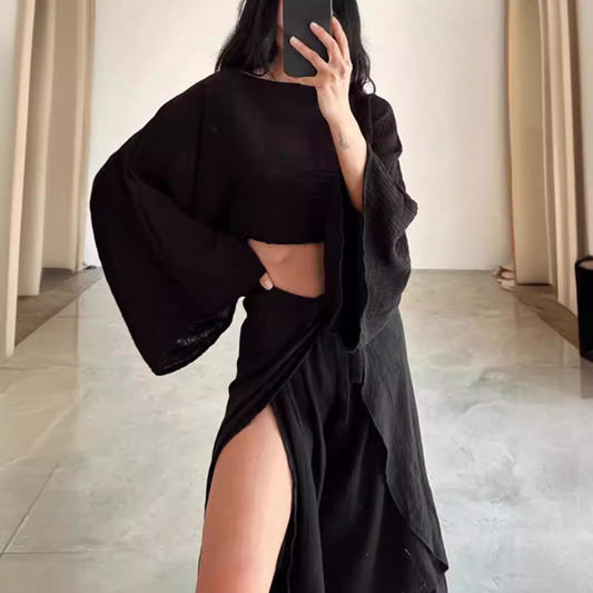 Women's Two-Piece Set – Backless Halter Crop Top – Pleated Long Skirt – Breathable Design