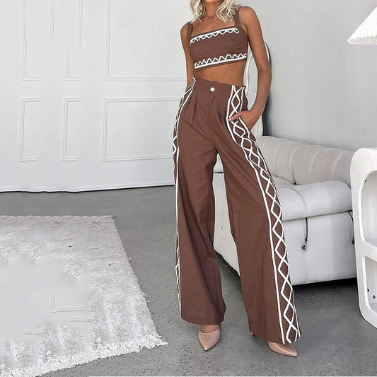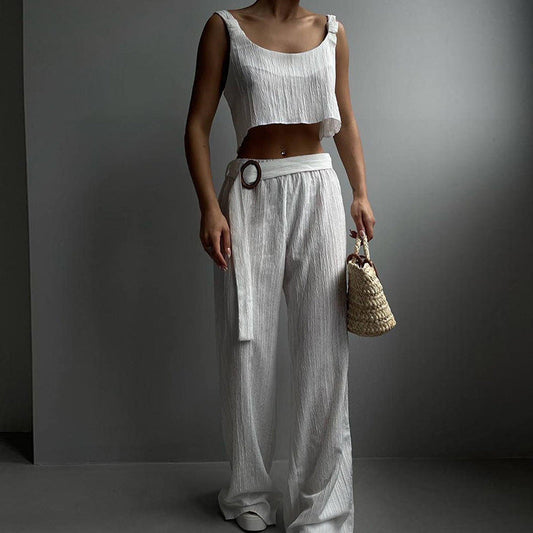 Women's Two-Piece Set – Crop Top with Tie Straps – Wide Pant Legs – Breathable Blend