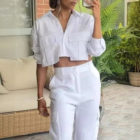 Women's Two-Piece Set – Relaxed Fit – Cropped Button-Up Shirt – Wide High-Waisted Pants
