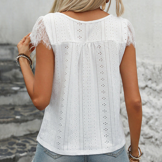 Women's V-neck Top – Eyelet Fabric – Lace – Relaxed Fit – Short Sleeves