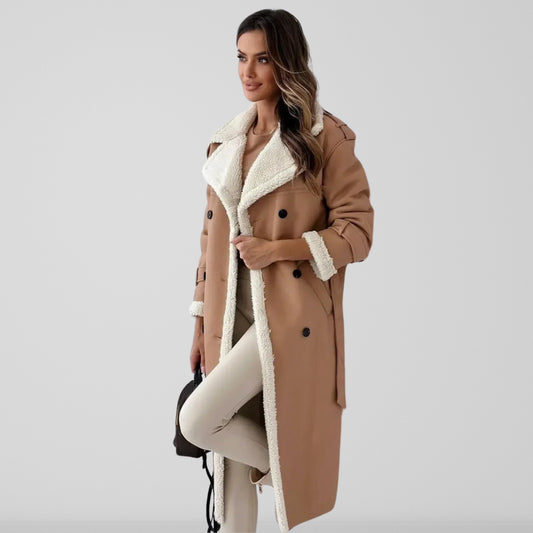 Women’s Trench Coat - Faux Leather - Double Breasted - Belted Waist - Shearling Trim