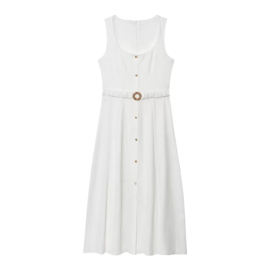 Women’s Square Neck Suspender Midi Dress – Button Front – Waist Belt Detail