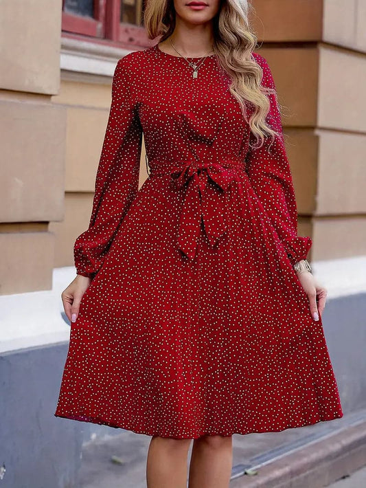 Dress for Women - Polka Dot Pattern - Cinched Waist - Long Sleeves - Round Neck