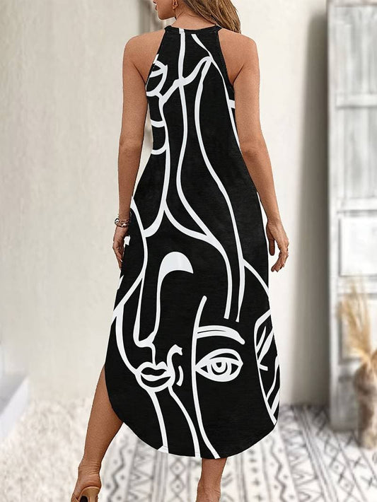 Women's Maxi Dress - Sleeveless Loose Fit - High Neck - Artistic Print