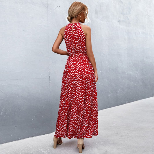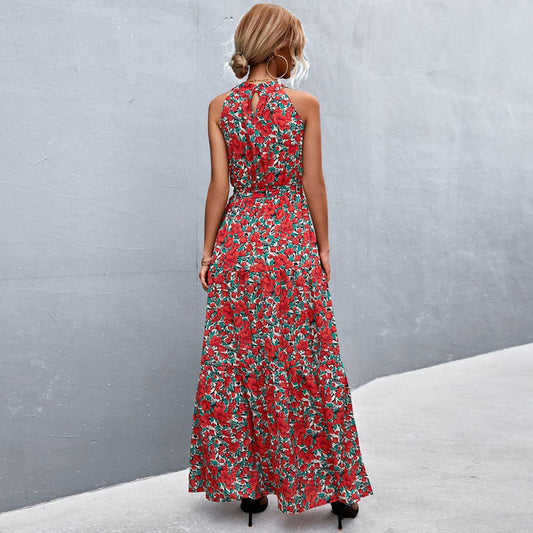Women Maxi Dress - Halterneck - Sleeveless - Floral Print - Tie at Waist