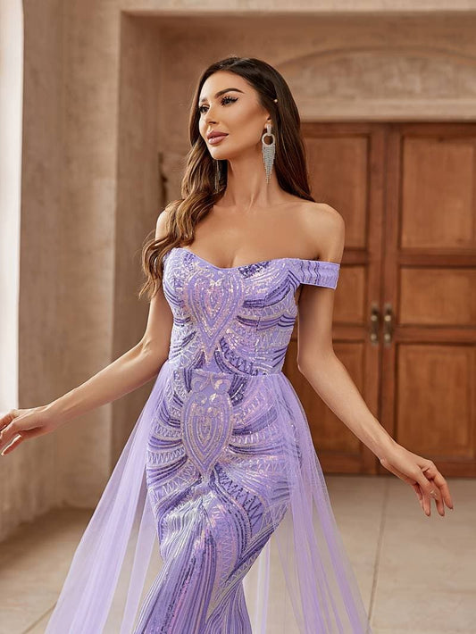 Women's Evening Dress - Off-Shoulder - Pearl Embroidery - Fitted - Long With Train