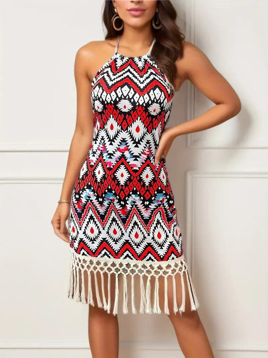 Women Halterneck Dress - Tight Fit - Knee Length - Bohemian Fringes