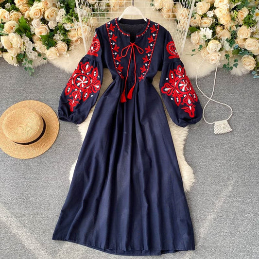 Women's Dress - Long-Sleeved A-Line - Embroidery & Tie - Airy & Elegant