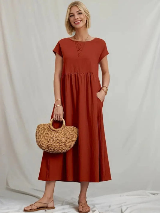 Women's Dress - A-line Fit - Short Sleeve - Round Neck - Midi Length - Lightweight and Breathable