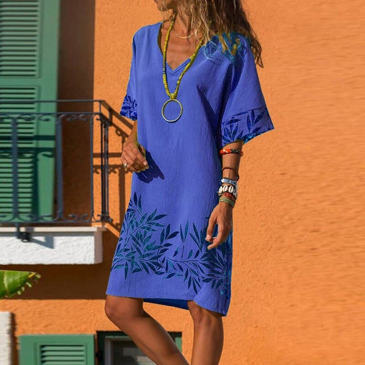 Women's Dress - Loose Fit - V-neck & Short Sleeves - Light & Breathable Cotton