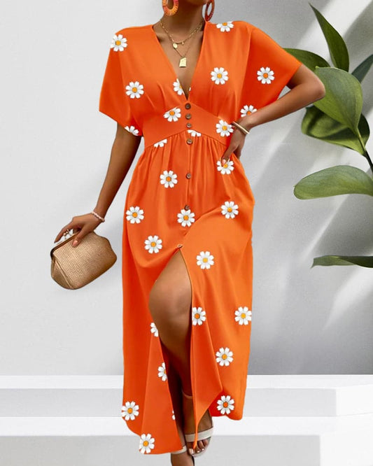 Women's Dress - Long Floral Model - Button Closure & Slit - V-neck & Short Sleeves