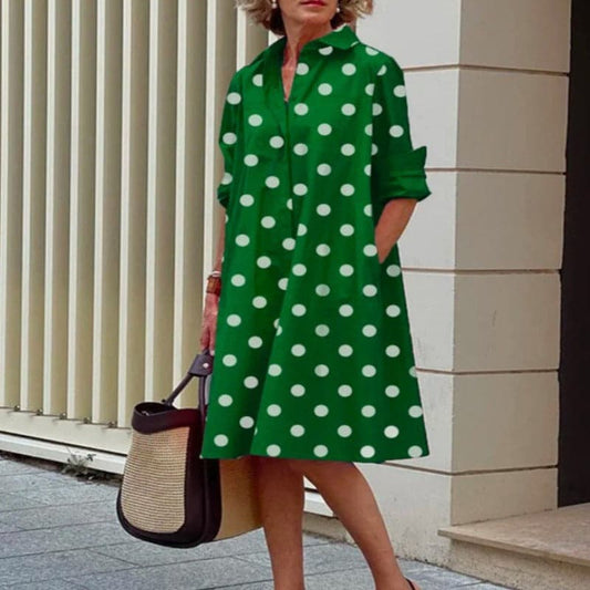 Women's Dress - A-line Cut - Polka Dot Pattern - Button Placket & Collar - 3/4 Sleeves