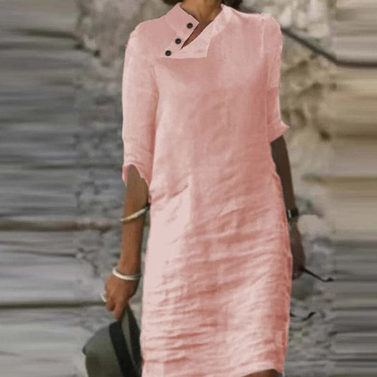 Women's Dress - Loose Fit - Knee Length - 3/4 Sleeves - Asymmetric Neckline with Button