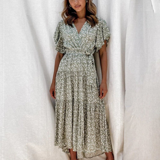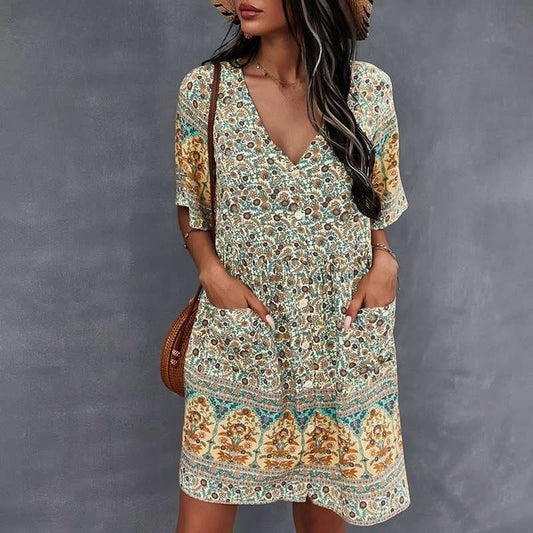 Women's Dress - Bohemian Style - V-neck Short-sleeved - Light and Airy With Print