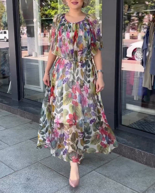 Women's Maxi Dress - Floral Print - Round Neck - Short Sleeves - Light and Airy Fit