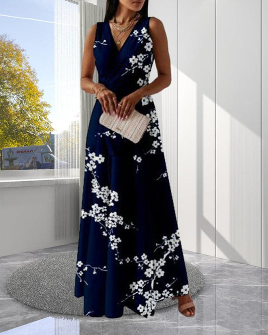 Women's Maxi Dress - Sleeveless A-line - V-neck - Floral Print - Elegant and Light