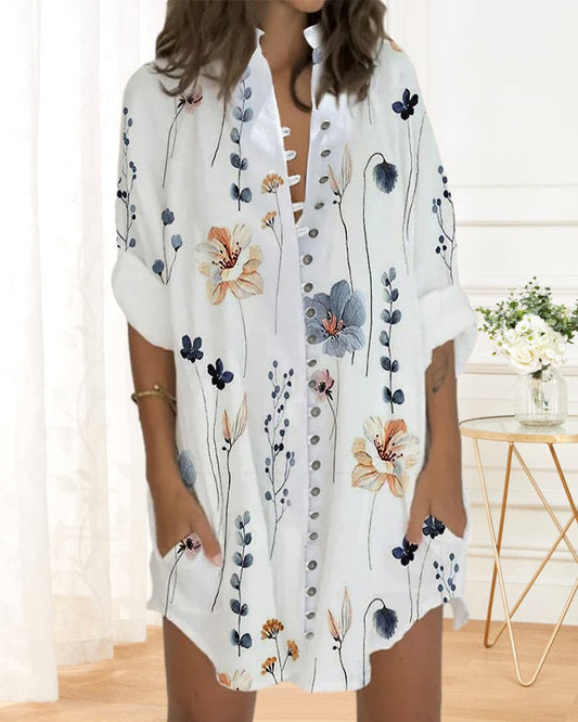 Women's Shirt Dress - Floral Print - Loose Fit - Button Closure - With Pockets