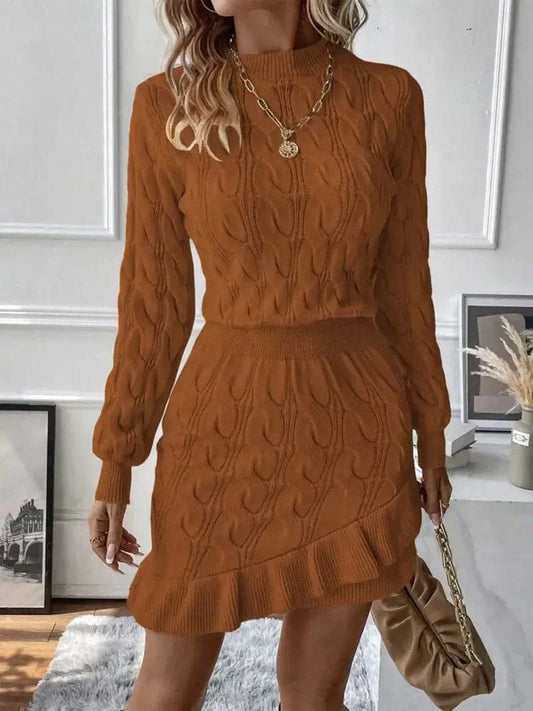 Women's Knit Dress - Cable Knit - Elastic Waist - Long Sleeved - Ruffle Edge