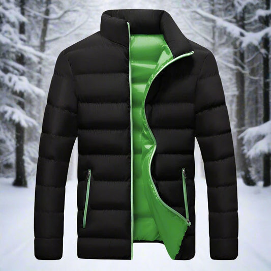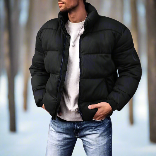 Men's Puffer Jacket - Windproof and Water-Repellent - High Collar - Zipper Closure - Lined and Warm