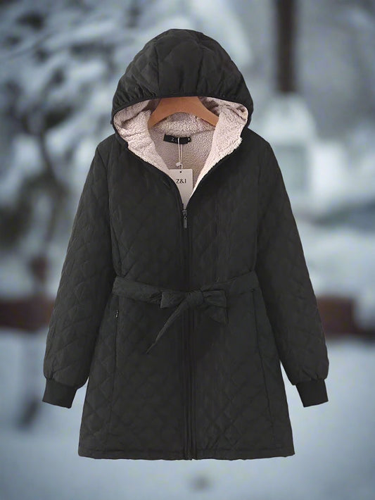 Women's Winter Jacket - Quilted with Hood and Belt - Warm Lined - Ribbed Cuffs