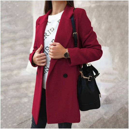 Women's Long Coat - Tailored Fit - Double Breasted Buttons - Elegant Wool Look