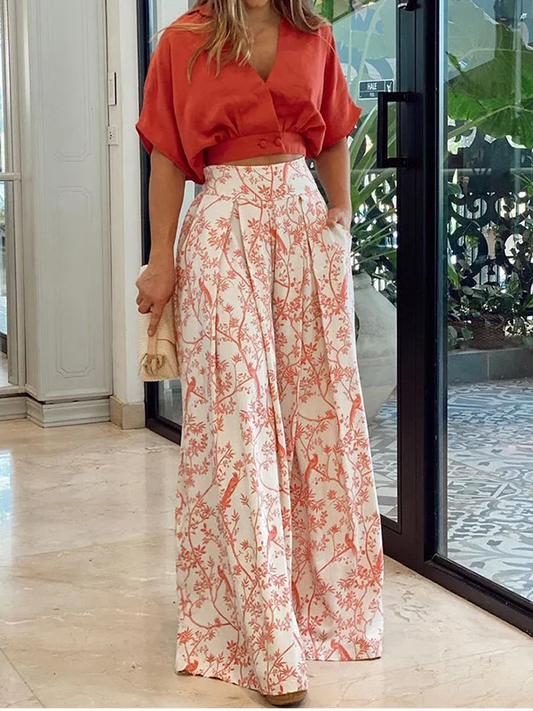 Women's Two-Piece Set – Sleeveless Top with Floral Print – Wide-Leg Pants – Relaxed Fit